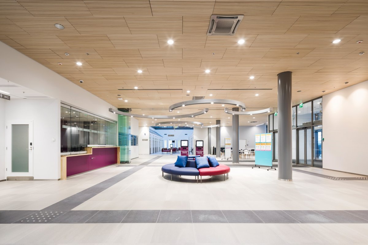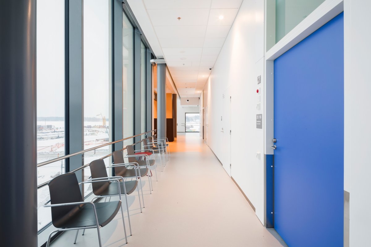 Placed along the perimeter of the building is a client corridor spaced by waiting and self-service areas at the points of facade projections. The consulting and treatment rooms surround the building’s centre area, which houses background work facilities of doctors and other specialists. These receive daylight through two large light wells as well as the high opal glass windows and top windows of the consulting rooms. Both light wells have mobiles by artist Jenni Rope installed in them, serving also as sound-abating elements in the high lobby areas. The yellow-hued mobile in the eastern light well and the blue-hued in the western help orientation in the groundwork spaces.