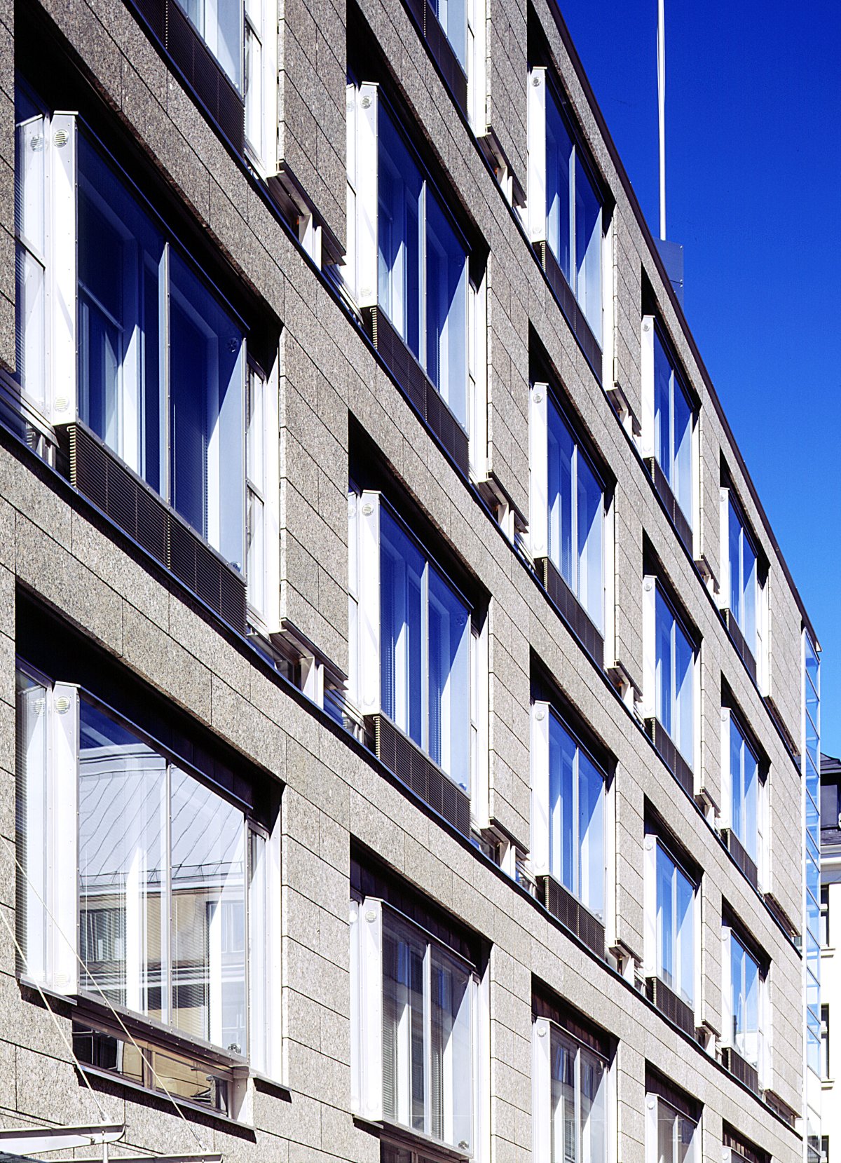 As a public building, it is appropriate for the ministry to stand out from its environment, while at the same time committing itself to the main principles of the coherent urban milieu. The street-side roof form continues the line of the neighbours. The facades are connected with the neighbours by a similar articulation, achieved by means of modern architecture, the relief effect of large window surfaces and narrow window strips. The blank areas of the facades are clad with Finnish granite. When the building had been completed, there was some discussion about this material, because it deviated from the render surfaces of the neighbours, but it does highlight the identity of a public building. On the courtyard side, the facades are concrete and have strip windows. This solution refers to traditional construction: it has been a custom to treat courtyard facades more modestly than street facades.