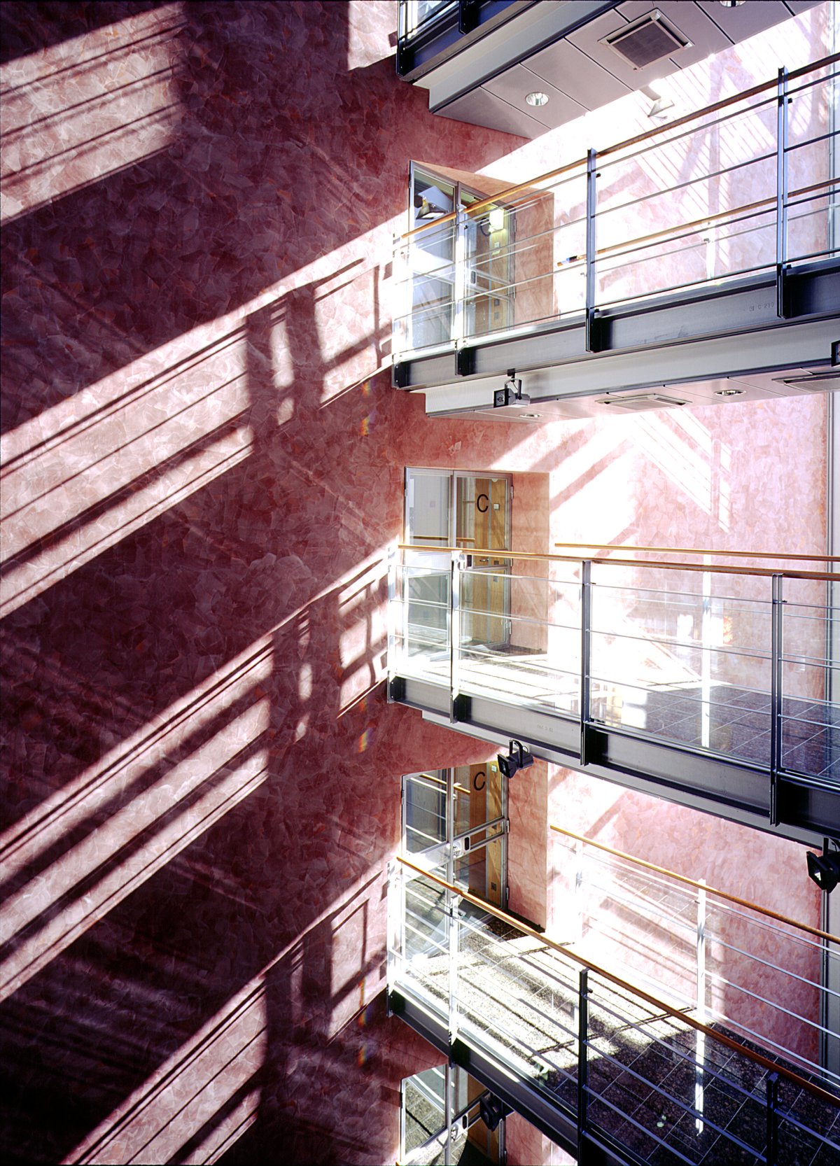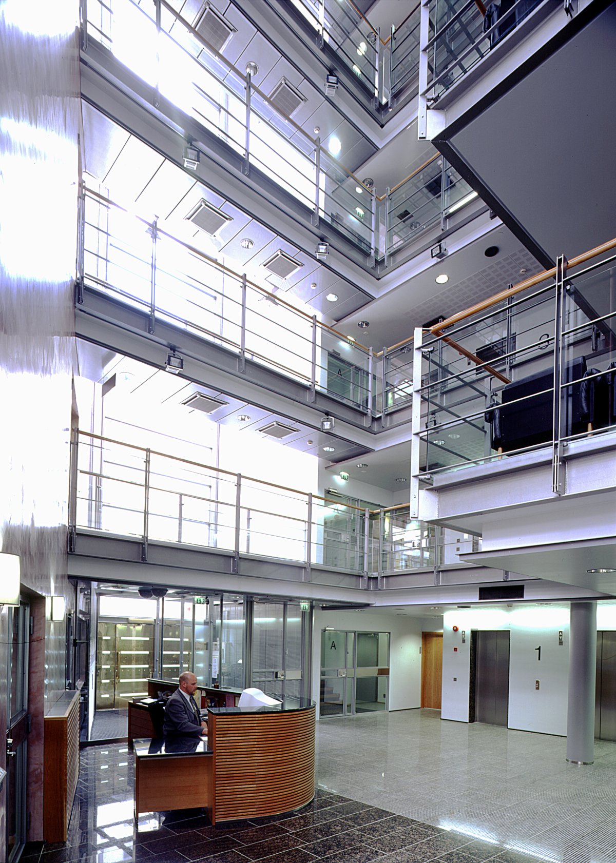 There are five stories of offices. The fifth floor is reserved for the ministers and their assistants; above this is still an attic floor housing a sauna department, meeting rooms and training facilities. In the main space of the building, the high entrance lobby, views open to all floors and to the bridges that connect the different parts of the building. Through the high windows, the passers-by on the street can see reflections of light on pale rose-red stucco walls and glimpses of a work of art by Robert Lucander, which climbs along a white wall surface. Besides the lobby, the ground floor contains a function room, library and staff restaurant.