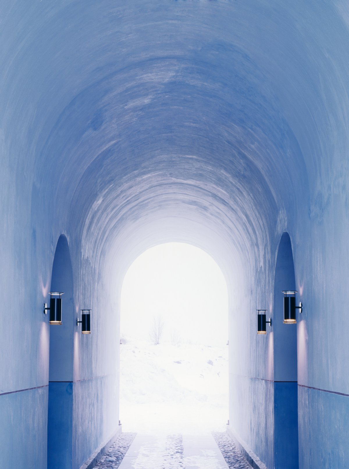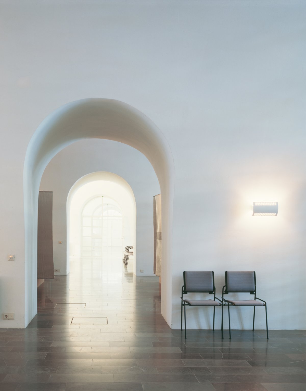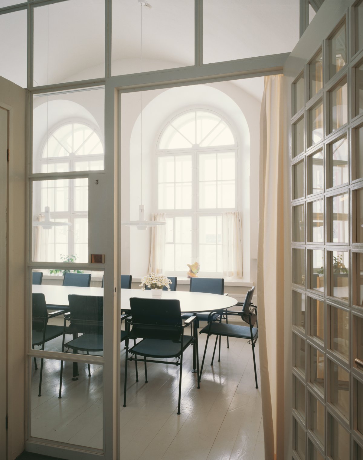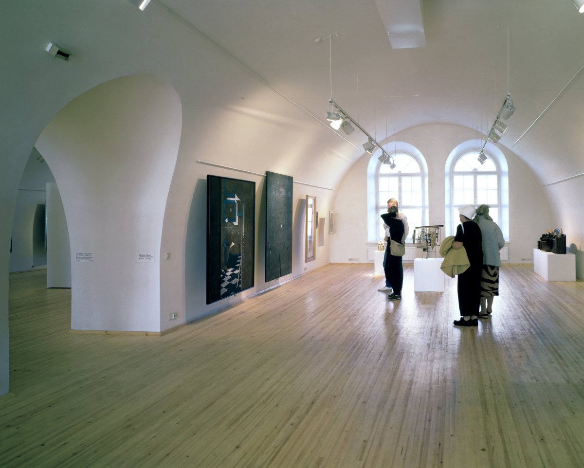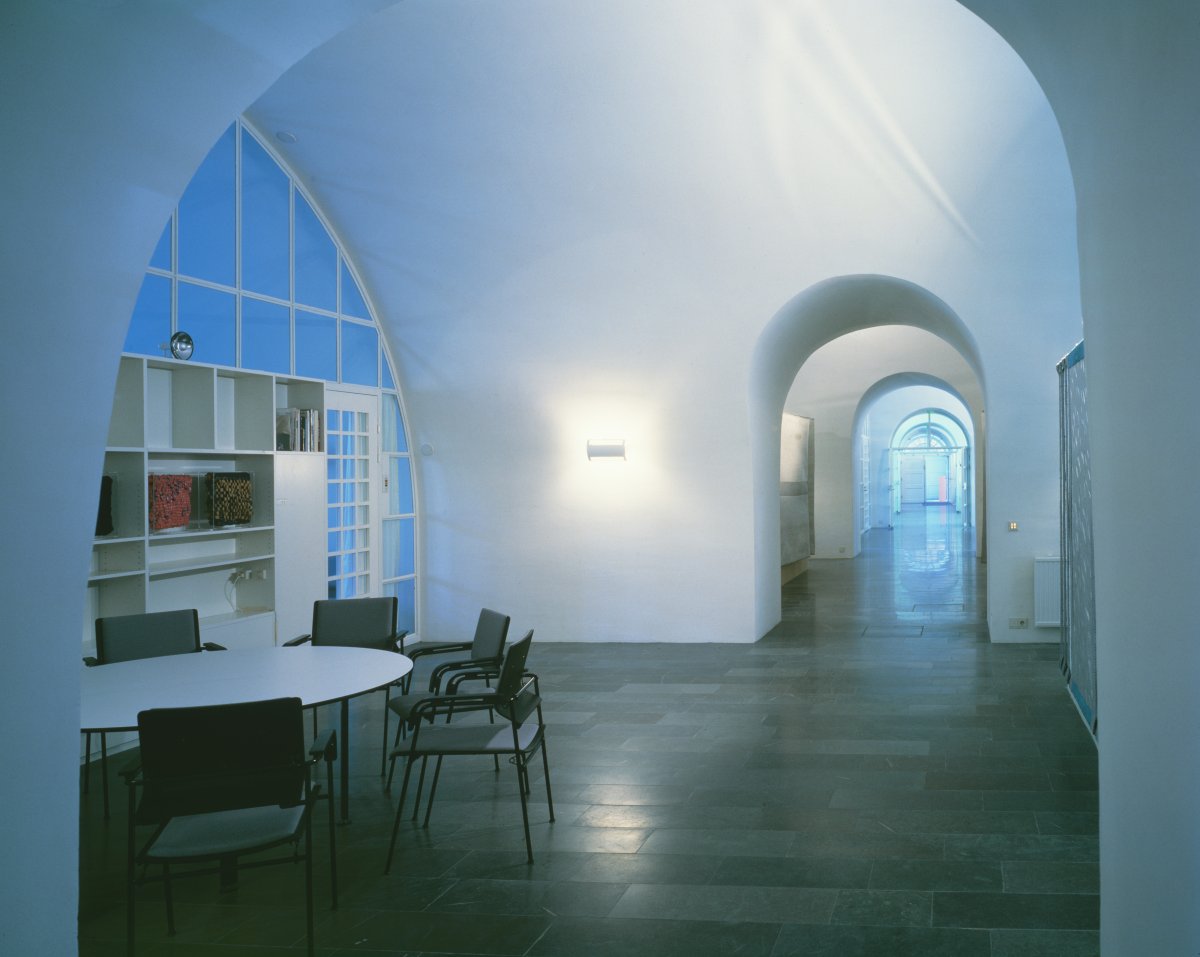 In the renovation of 1983–85 the building was converted for the use of the Nordic Arts Centre. The programme comprised an exhibition space (Gallery Augusta) with workshop and storage spaces as well as a library, offices, studios, meeting rooms, picture storage, photographic laboratory, and an apartment. The auxiliary functions were concentrated in separate cubic volumes in the centre area of the vaults and the new partition walls were detached visually from the original walls by means of filigree glass zones. This made it possible to preserve the pure geometry of the original spatial organisation with uninterrupted views through the whole building both longitudinally and transversely. A tunnel was dug under the building for technical installations, because museum authorities would not allow interfering in the sand layer of the roof.
