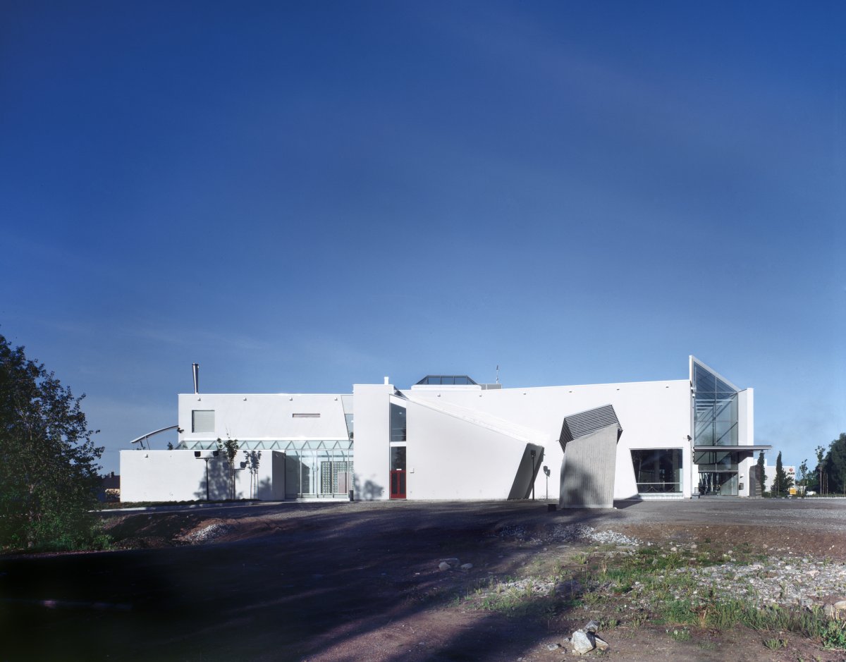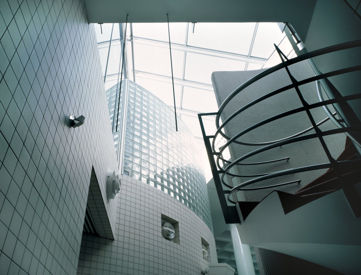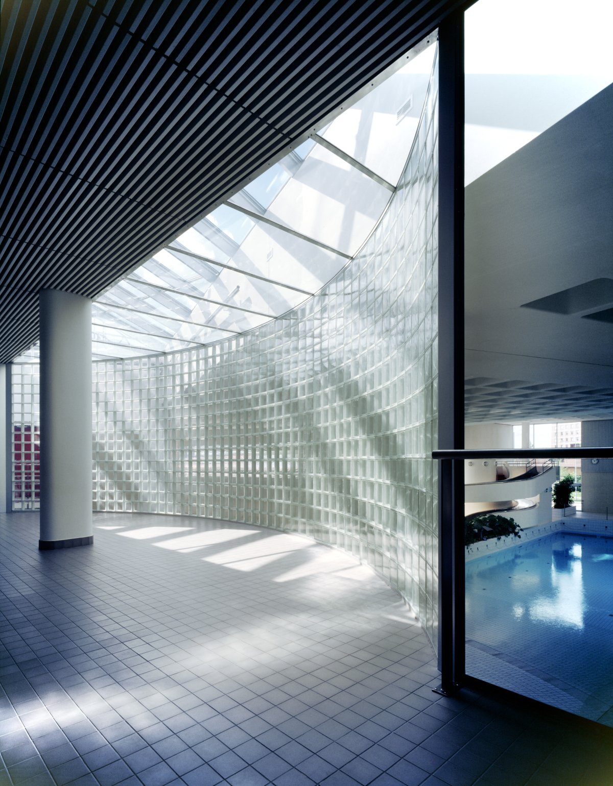 The bath is situated near the centre of the town on a flat site surrounded by a heterogeneous building stock, in the middle ground between an old low-rise area and newer blocks of flats. Besides its functional task, the new public building was to give meaning to its surroundings, to create a specific identity and spirit for the place. The sprightly, multiform architecture reflects the interior activities and spa atmosphere, which is also conveyed outwards through large curved and prismatic glass surfaces. Rendered lightweight concrete aggregate blocks give the facades a uniform material effect, which gathers together the design themes.