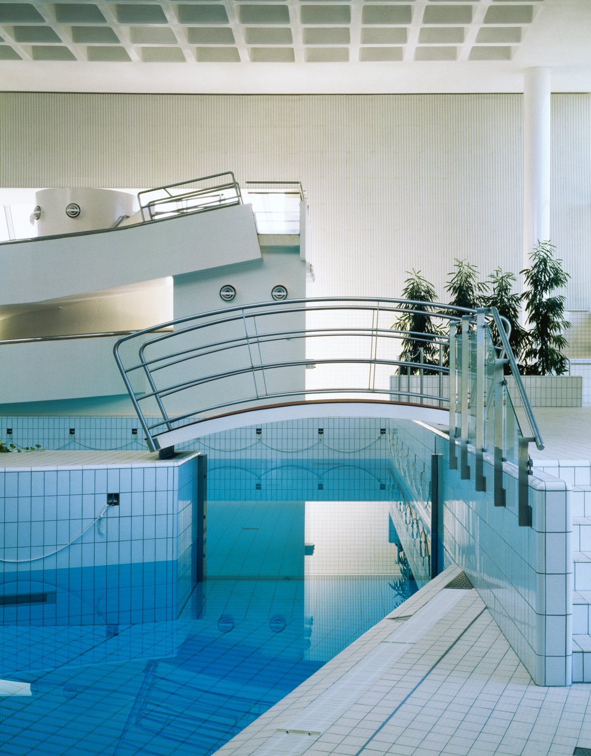 A great, warm, comforting, luminous and exciting volume is generated. Almost all the pools are linked in a free-flowing geometry that allies the sensual curves of the Finnish shore-line with the rectilinear exigencies of the rules of competitive swimming. Little canals between bosky islands allow you to swim between one kind of experience and the other. The great slabs of the roof are carried on cylindrical in situ white painted concrete columns which are so thin and wittily placed that they seem almost invisible.