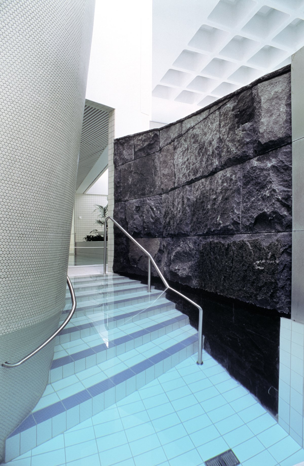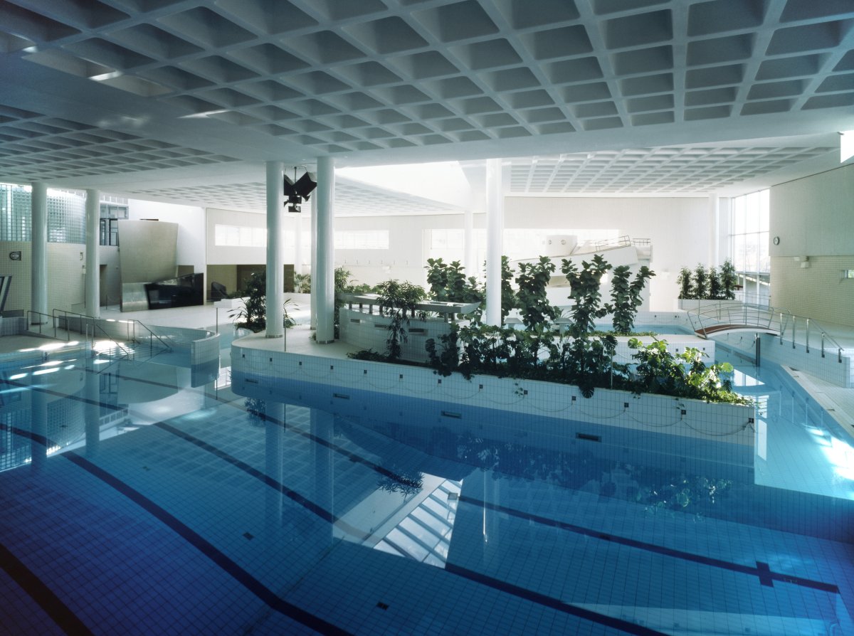 The main pool connects with a free-form recreation pool and a 25-metre fitness pool. The equipment includes a wave machine, slide, diving board, three-metre diving tower, cascade and water massage nozzles. The pool is shaped by islands, peninsulas, bays, straits and bridges. Some of these contain pot plants suitable for the conditions of a swimming pool space. There are separate pools for educational and therapy operations, small children, cold water bathing and whirlpool bathing. The locker room, washroom and sauna spaces are divided into four units. A private sauna with lounge including meeting equipment is also available. The building also houses gyms, solarium, physical treatment institution and hair salon, some of which are run by entrepreneurs.