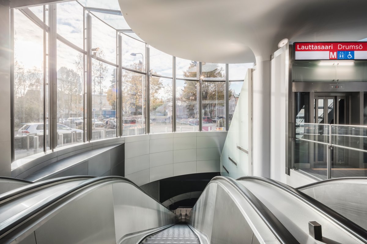 The Lauttasaari station has two entrances. The entrance hall at the eastern end is located at a street corner beside a shopping mall. It is dominated by a glass cylinder, inside which a slanting lift and an escalator dive under the crossroads into the platform area. The cylinder is supported by a concrete mushroom column, which can be seen as a reminiscence of the old concrete water tower that was the landmark of Lauttasaari. In the western entrance hall the structures of the curved ceiling and walls are exposed. Made of light treated bent glulam wood, they compose a continuous column and beam construction. The roof extends all the way to the ground on the street side. The other exterior walls are mainly glass. The roof is covered with pre-patinated zinc sheet. Slate, a material typical of the 1950s, is used in a modern way, split and laid in horizontal position. The courtyard paving and massive stone walls are gabbro. The colours of the materials were chosen to suit the 1950s palette of Lauttasaari. The station features a light installation.