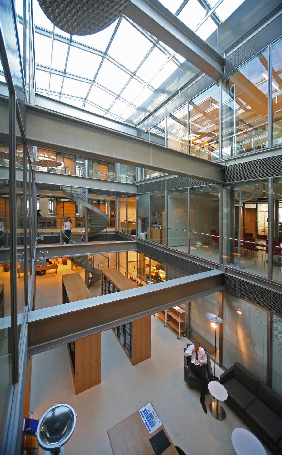 The three-storey high extension of office area was built of vierendeel frames. The loads of the new structure were led five stories down inside the wall structure of the old building, all the way to the foundation of the lower basement. In this way the theatre and its foyer could be preserved and restored without any new visible structures. The new office interior is a modern space with an interior glass wall system and light well.