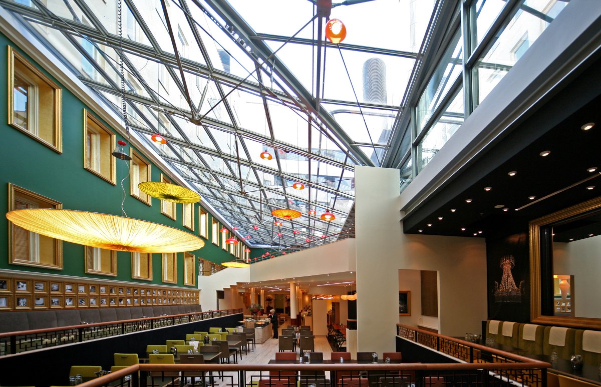 Another new building part is the previously open inner courtyard, which was covered with glass and converted into a restaurant. The courtyard deck was demolished and a new one built, raising it to the same level with the theatre foyer. Nowadays the entrance of the theatre as well as the lobby and foyer also serve the customers of the restaurant. The two basement floors of the building were renovated, and a new restaurant kitchen and staff facilities were built in the higher one. The interior decoration of the courtyard restaurant is in contrast with the character and architecture of the building. The task was given to an English-Swedish designer.