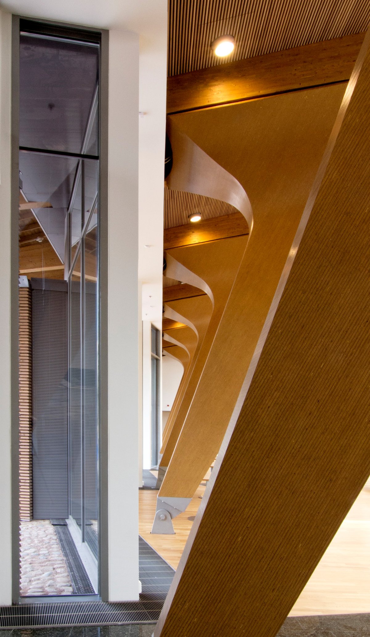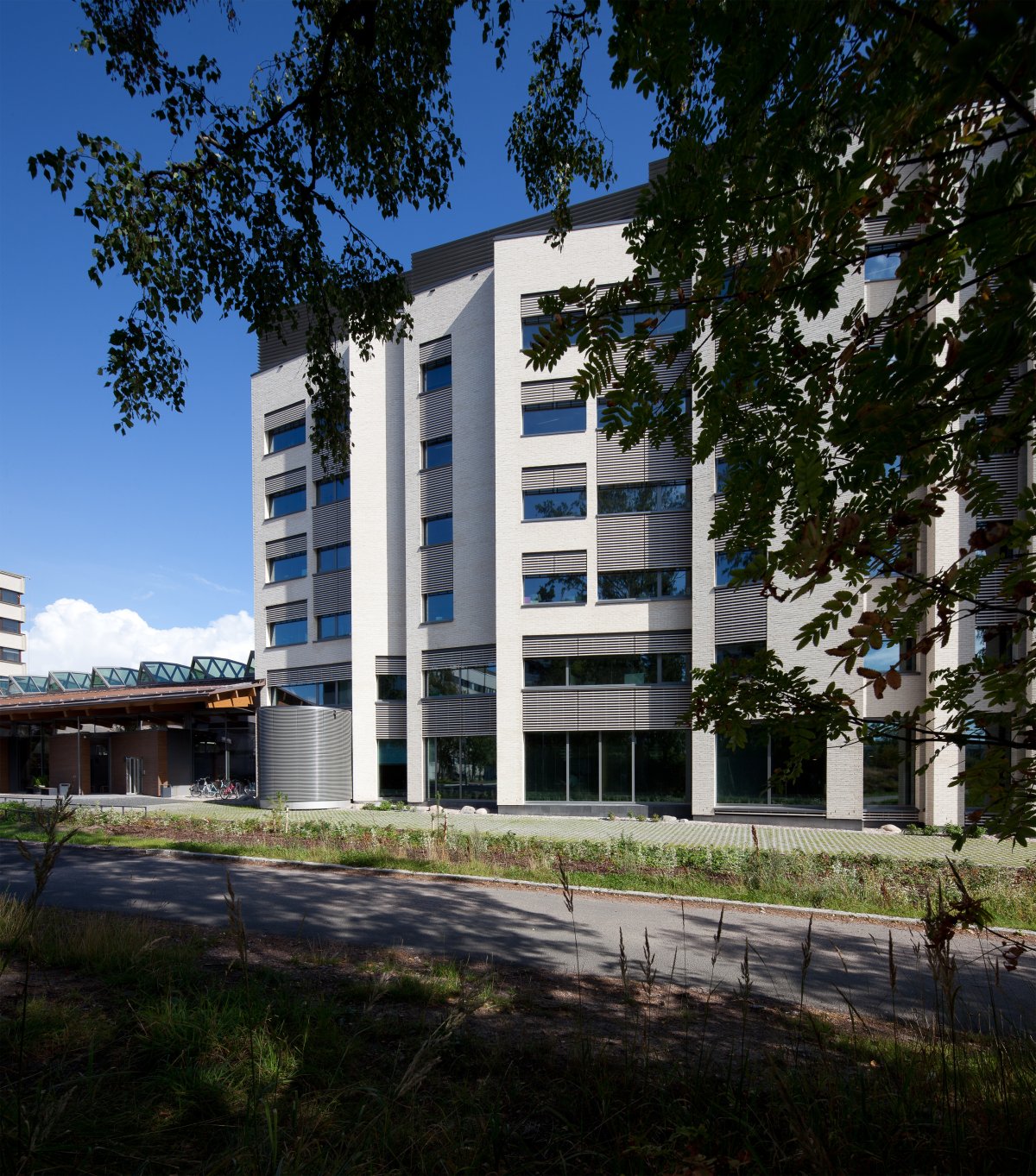 When the building was already in use, it appeared that there was a need for an auditorium bigger than the original one. Its design started in early 2015. The site had scanty area for additional building, but the solution was found in a broad fan-shaped room with sloping floor. The structures are mainly wood. The roof consists of stressed skin panels supported by one glulam principal beam and exterior walls. The wooden battening of the exterior cladding joins the facade to the function room of the main building that was completed earlier.