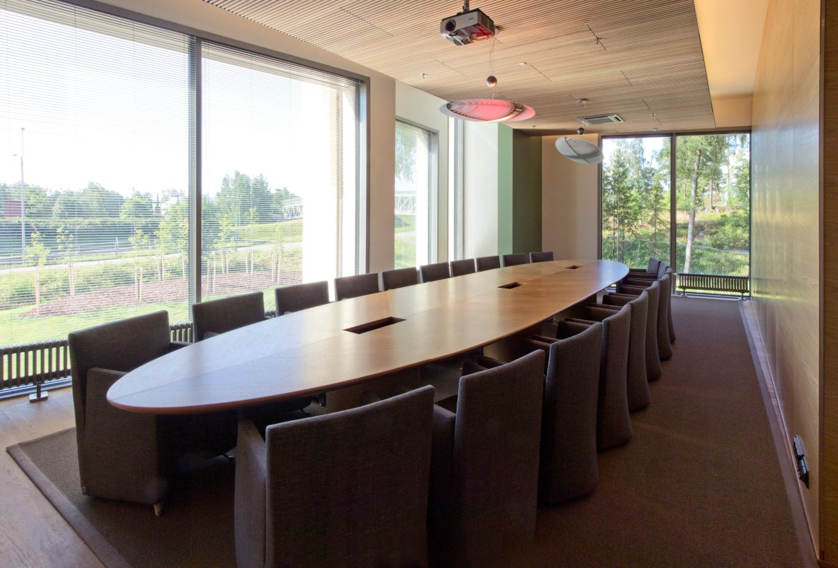 Clerical work mainly takes place in open areas. Along with them, the needs of a modern, fluctuating work community are addressed by teamwork rooms, meeting rooms and rendezvous points. Daylight as an energy saving factor was given special attention. The open areas were grouped to face the sea, while the separate rooms were located to the courtyard side. Wood is an essential material in the office areas and meeting rooms as well as the exposed parts of furnishings. The new and old office spaces are connected by a one-storey-high restaurant-cum-function room, whose architecture is based on the top products of Metsäliitto’s own industrial businesses. The aim was to achieve a pillar-free space functionally as flexible as possible. The main supports are trestle structures with pillar elements of milled laminated wood and double beams of glulam wood. The interspace of each double beam has a window opening, the blank secondary sections are heat insulated wooden stressed skin panels. These components were all but finished when brought to site.