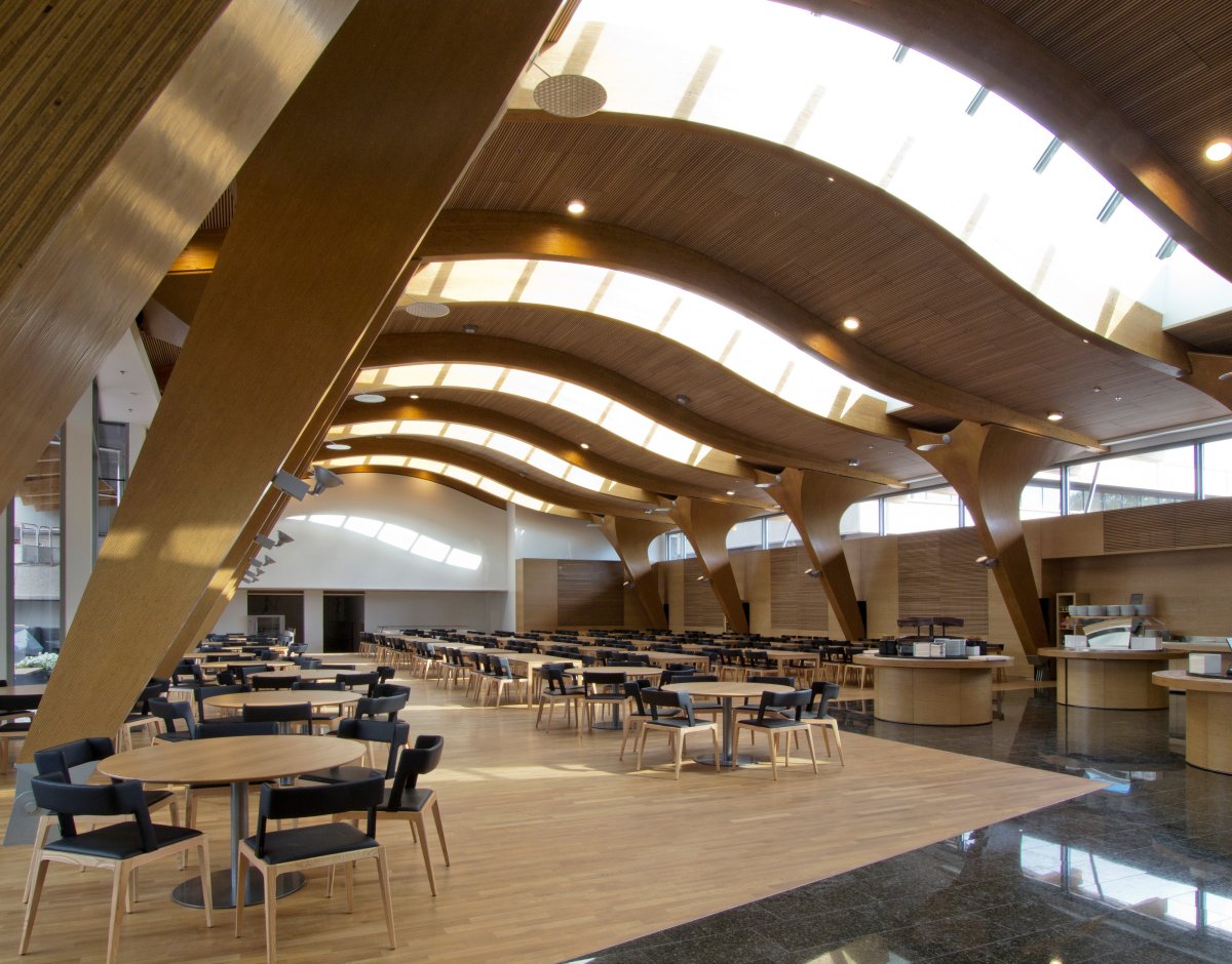 A perfect space… Helin & Co Architects designed a staff restaurant for Metsä Group and Mela in Tapiola, Espoo, giving prominence to the aesthetics and functionality of its wooden structures. Their sculpturality is accentuated by light coming in from between the curving beams.