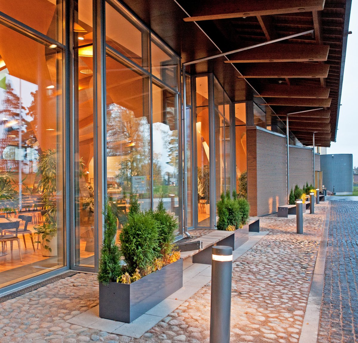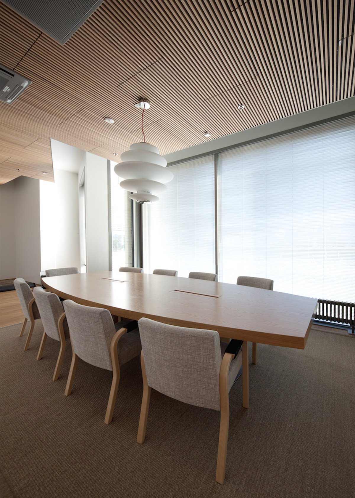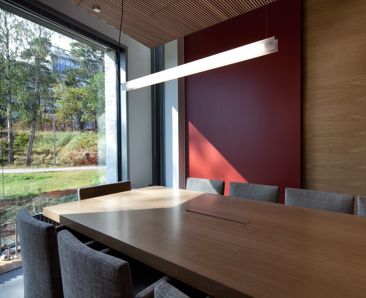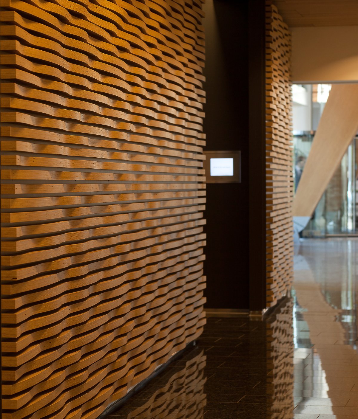 Tapiola is traditionally marked by a humane dialogue between architecture and nature. As an abstract metaphor of a birch forest, the facades of the new building were articulated by vertical sections bent in varying angles. This produces many variations in the interiors, spatial rhythms and views opening towards the sea.