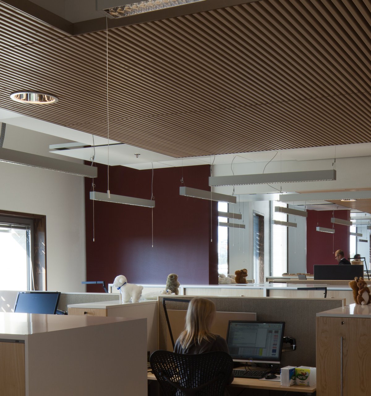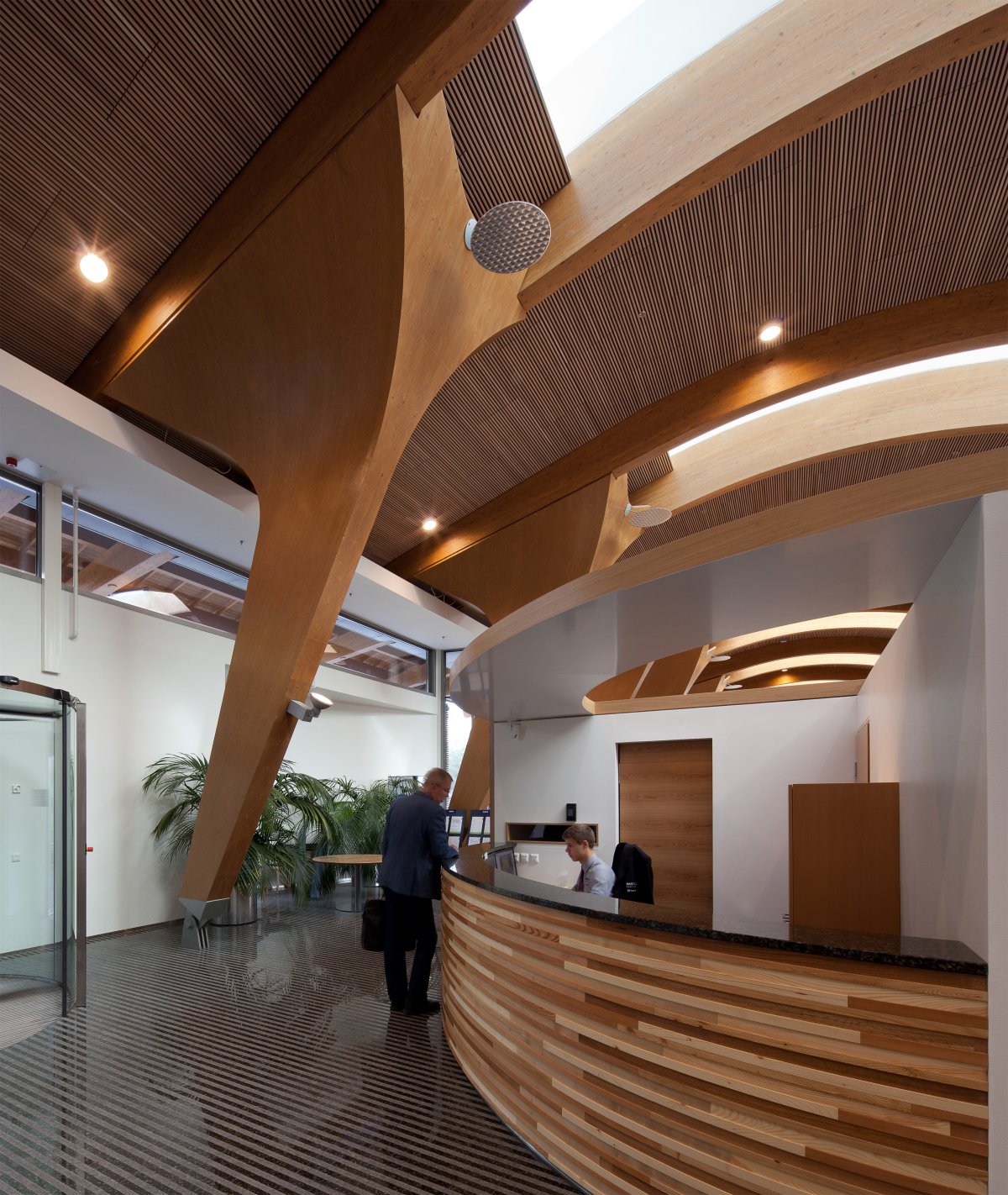 In the design of the new part, much was invested in environmental issues and energy efficiency. The technical installations and lighting were integrated into a part of the multiform interior architecture. The rooms are heated and cooled by means of panels installed in the ceilings, which makes indoor conditions pleasant through the year. The system utilises cost-free energy very efficiently.