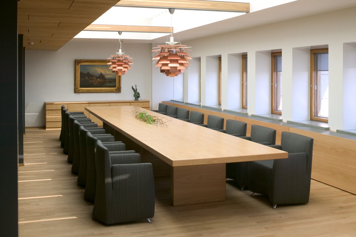 New chairs and tables were designed for the restaurant, using birch plywood for the frames and oak for surfaces. The lounge of the managing director was supplied with custom-made sofas, chairs and low tables as well as a sofa-bookcase combination that serves as a room divider. The 7th floor was furnished as the management’s meeting rooms.