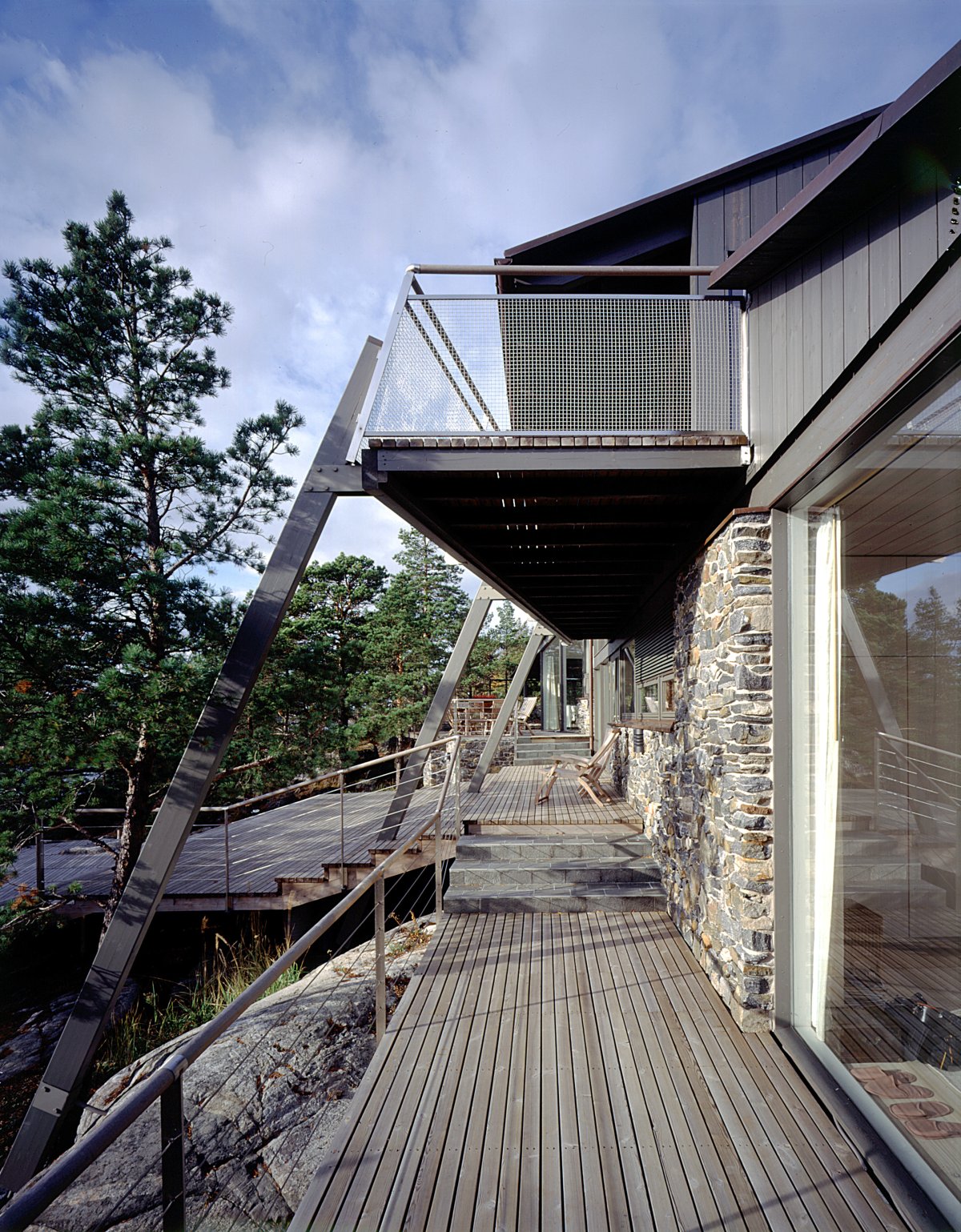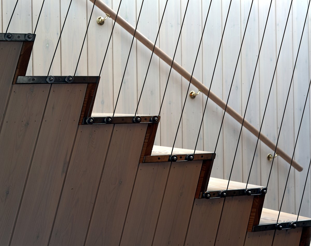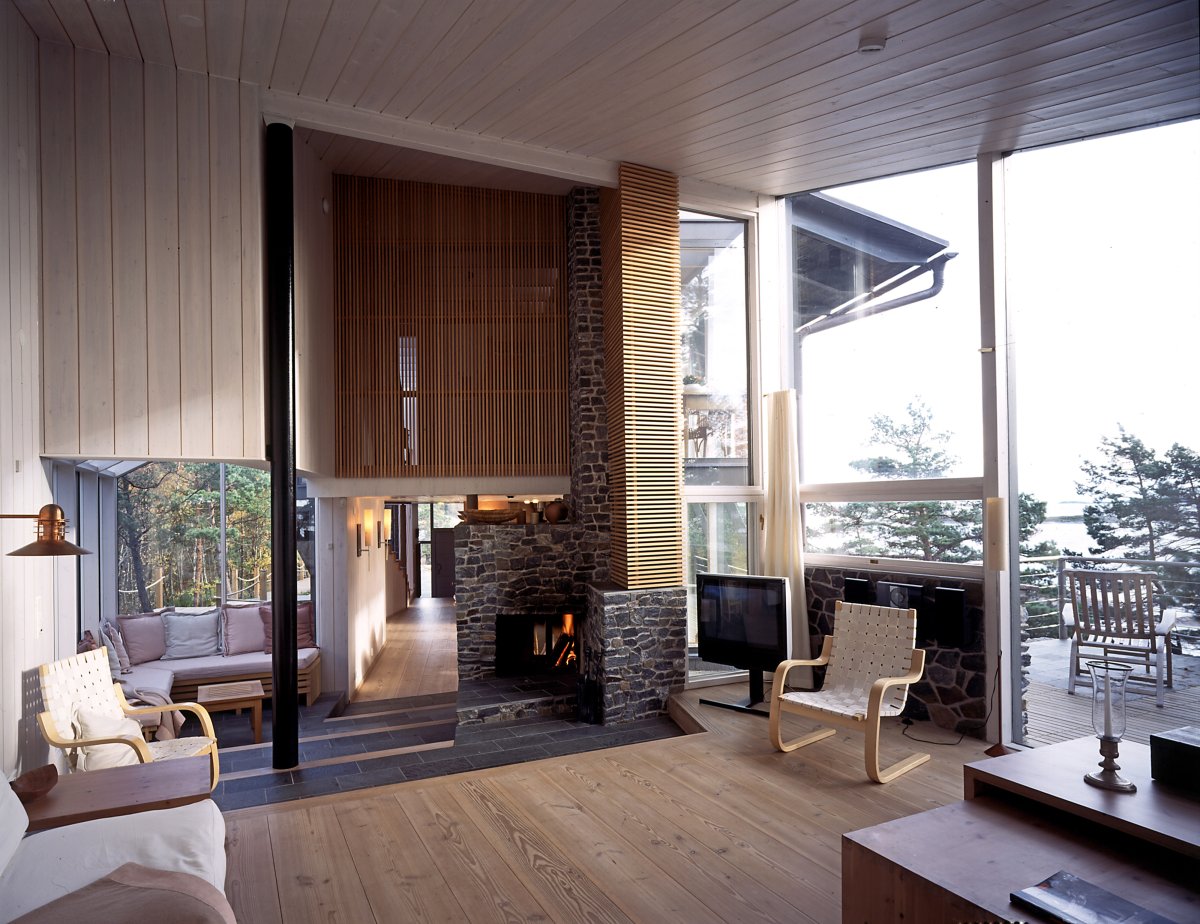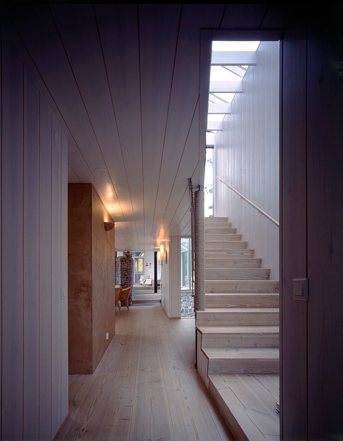 The interior materials are mainly wood: walls of broad white-stained pine boards, floors of very broad bleached Douglas fir planks, kitchen fittings of maple. The entrance floor is of quartzite tiles, the fireplace of stones collected from the site. Important filigrees in terms of scale are boat cables with their blocks and rigging screws used in railings, a small amount of steel netting, hemp rope around the one steel column of the house, and thin battening.