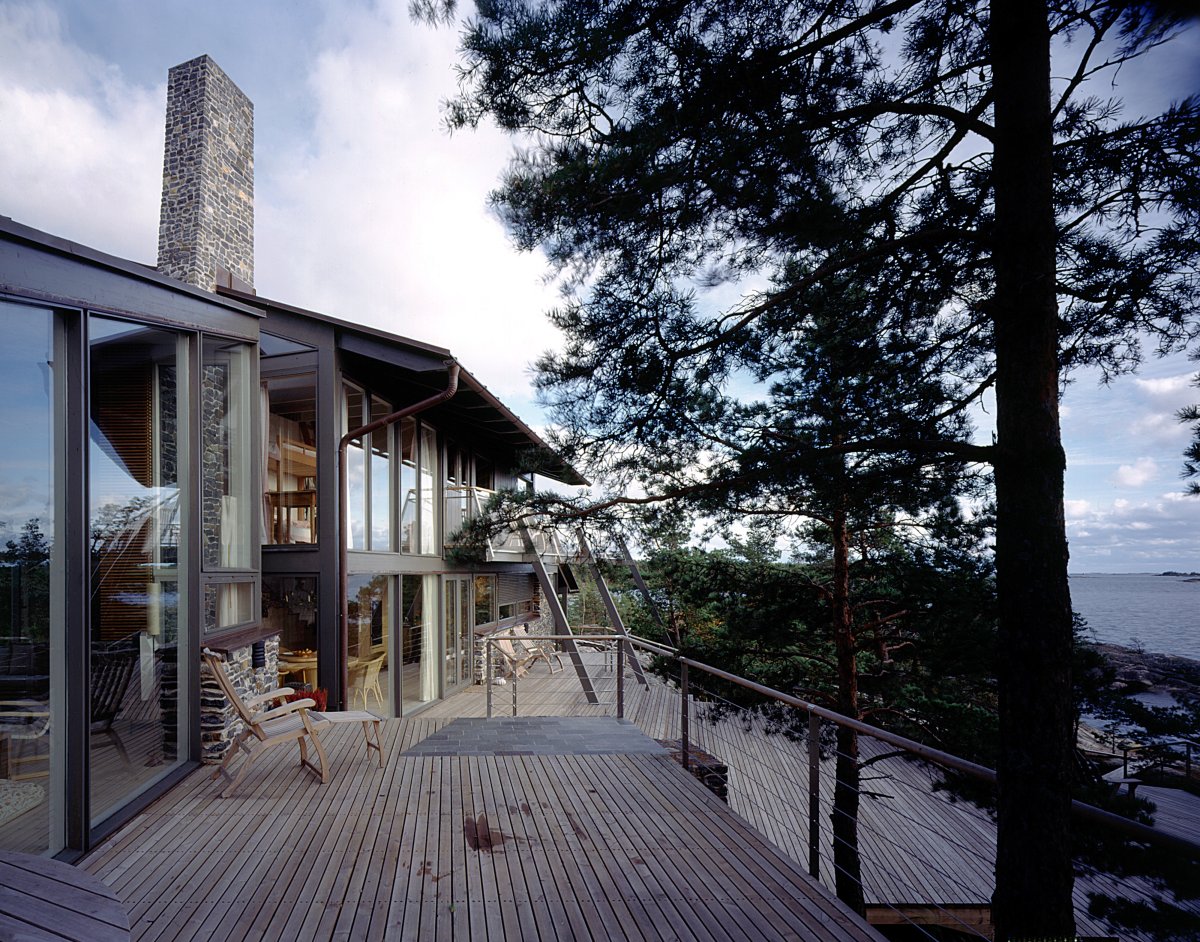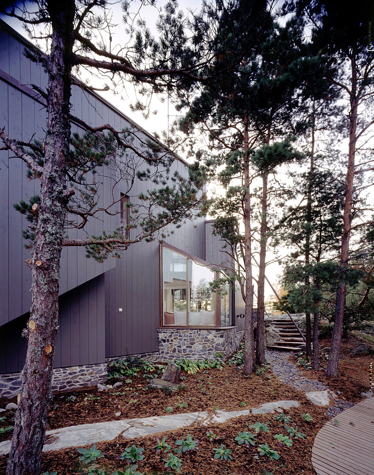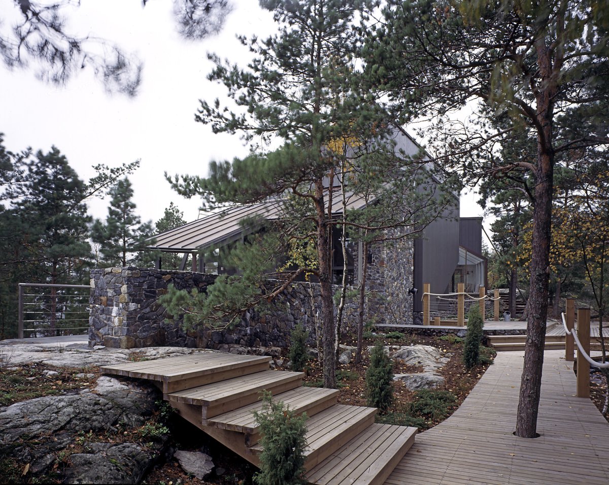When you build on an island in the sea, you must carefully protect the scenery and nature while utilising a unique place and situation. The choices of exterior materials were mainly self-evident: wood for the frame, boarding for exterior cladding, stones collected from the site for a masoned wall and green copper blending in with tree branches for the roof. The grey shade of the boarding was taken from rock scratches and lichen growing in them. The coating is fully non-toxic and based on natural wax. To save the rock vegetation, the lounging areas and paths of the courtyard are demarcated by boarded terraces and bridges.