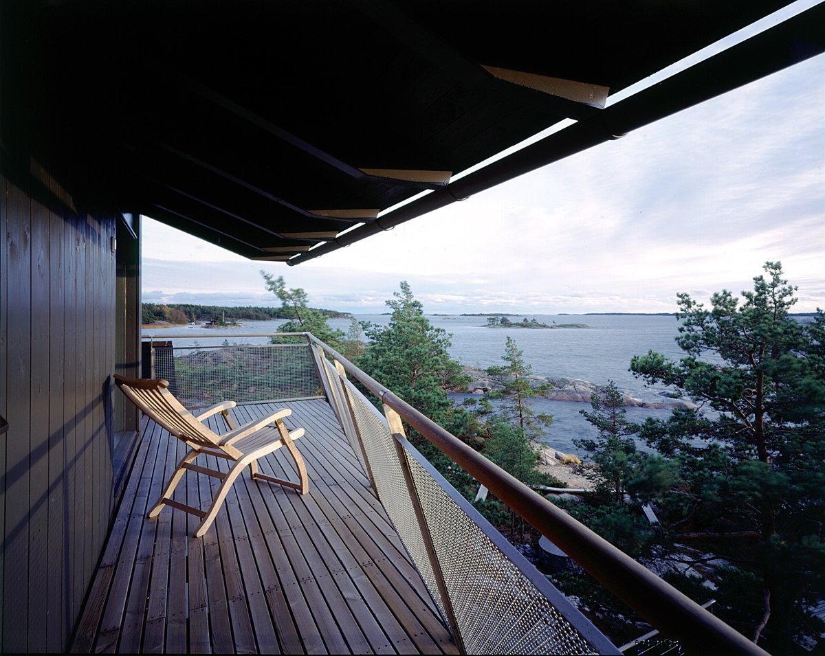 The upstairs sauna and bedroom open to a balcony with views over the Galtarna islands and the Bengtskär lighthouse. Seen from the sea, the building disappears into the branches of the pines growing on the rock.