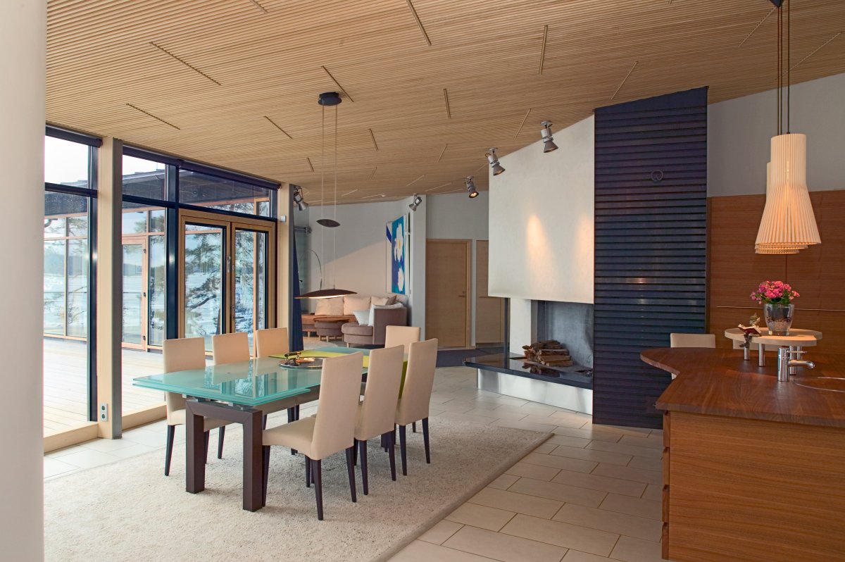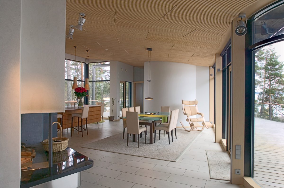 The interior flows from the main space to the bedrooms and out to the free-form terraces that open in three directions. The house turns its back to the direction of approach and the neighbouring sites, opening smaller windows towards them, and embraces a terrace facing the lake. A person sitting on the terrace has a 360-degree view of the lake via reflections on the large windows.