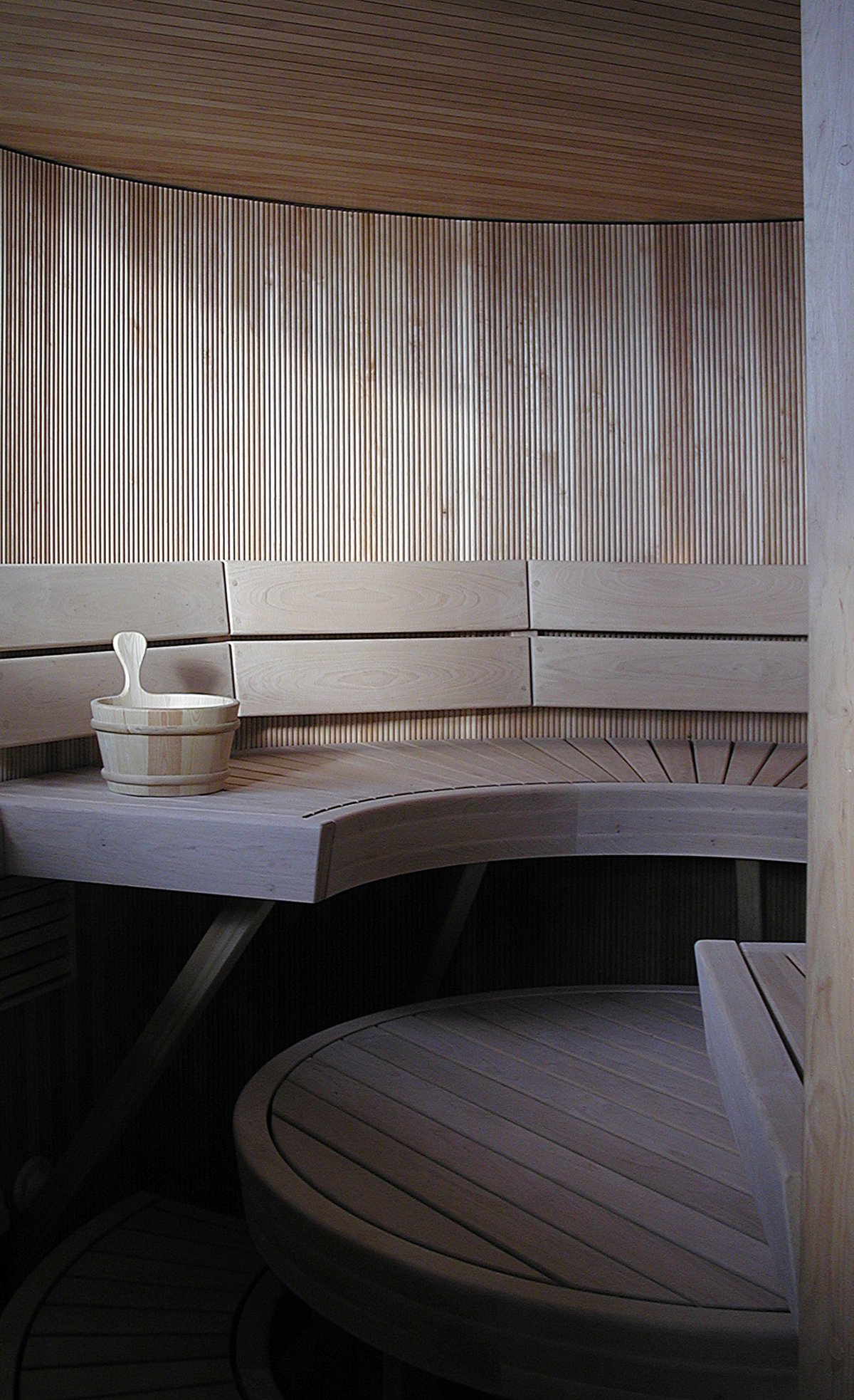 The interiors are marked by the pale ceramic tiling of floors and the fan-like birch battening of the ceiling, made as custom carpentry work. All fixed furnishings were custom made by cabinet makers mainly from walnut.
