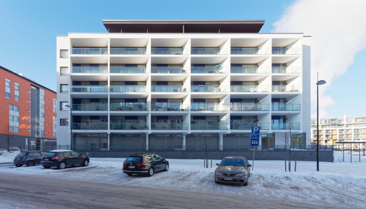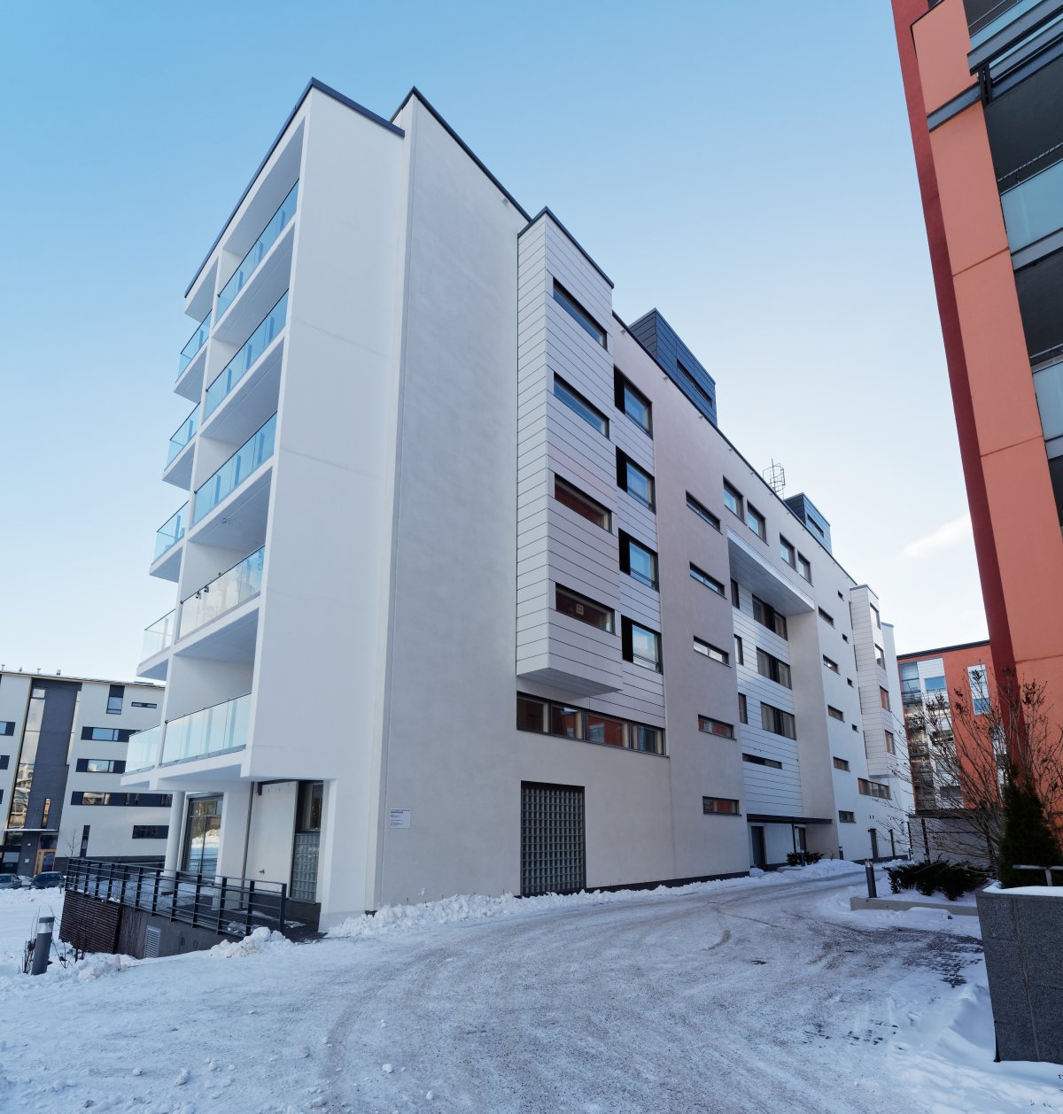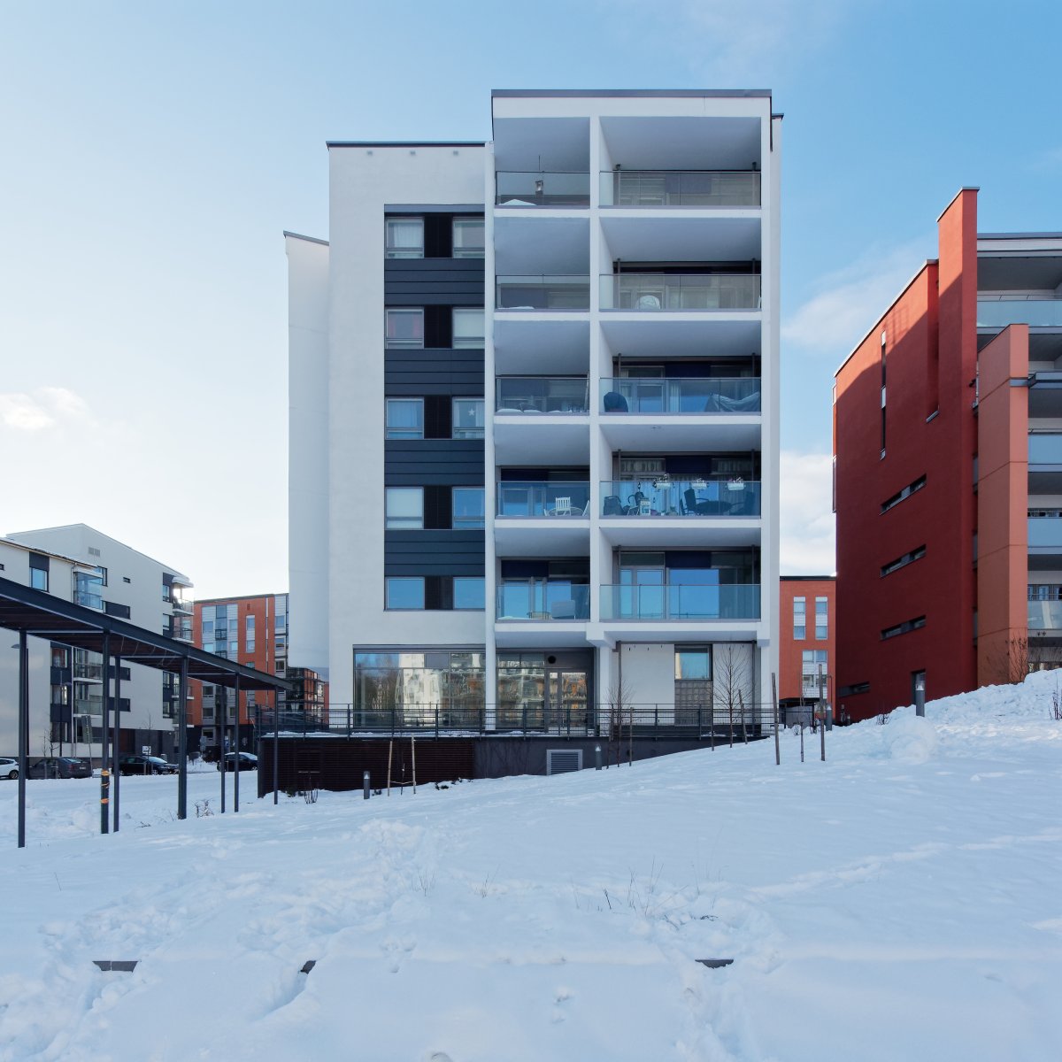 The Aurinkohalssi building (‘sun tack’, referring to a sailing boat) is situated near the salmon steps on Hellekuja street. The south-eastern balconies afford views over the canal and the forest beyond. The building has 48 rental flats arranged around two stairwells, varying in size from small studios to large flats of three rooms and kitchen. The rooftop floor contains two owner-occupied flats. The garage under the courtyard deck is shared with the buildings surrounding the end of the canal. The ground floor houses common facilities and a business space, all having access to the northern side of the building as well as to the south-side arcade under the balconies. The courtyard area on the canal side is provided with a playground and pergolas, one of which separates the Helleaukio square from the courtyards of the buildings at the end of the canal and also provides a rest stop for residents as well as joggers.